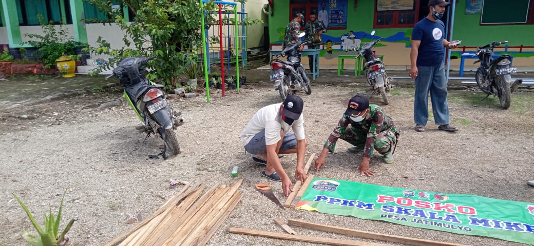 “Dengan memanfaatkan bangunan ruang PKK Desa Jatimulyo, kami bersama warga serta perangkat Desa Jatimulyo bergotong royong mendirikan posko PPKM Mikro ini,” ungkap Kopda Hariyono, Senin(15/3/2021).