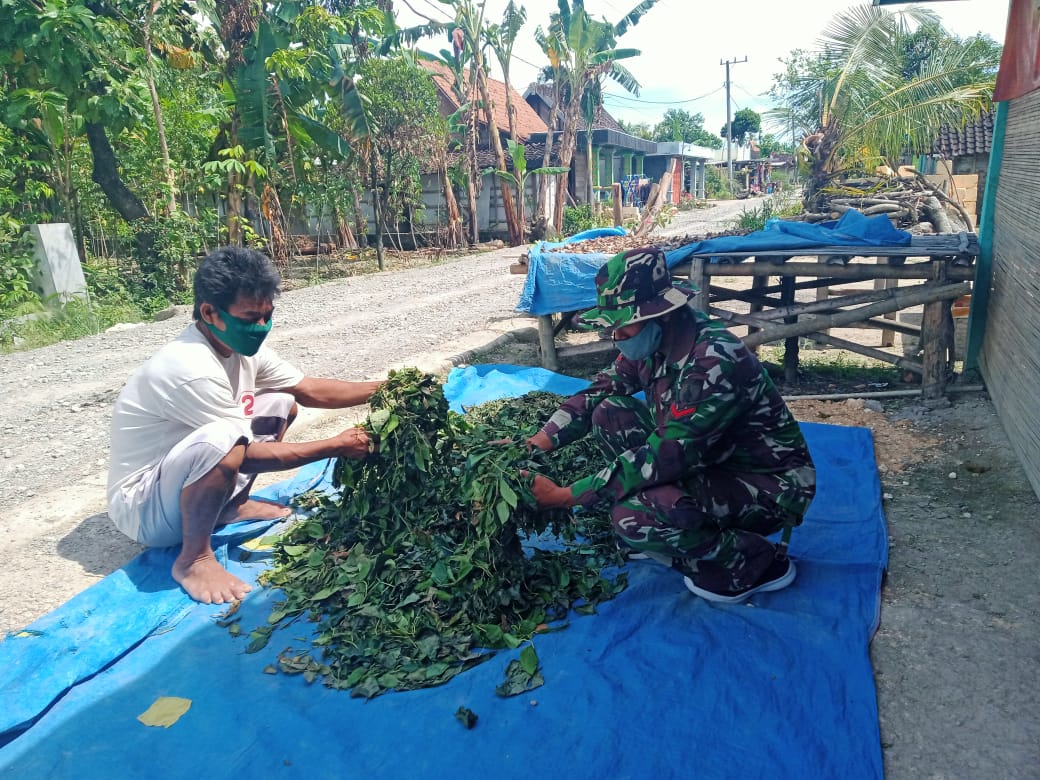 BOJONEGORO – Satgas TMMD Ke-110 Kodim 0813/Bojonegoro Kopral Dua (Kopda) Anang Yuni meyempatkan diri membantu Bapak Ngarianto mengeringkan Daun Sirih untuk di jual.