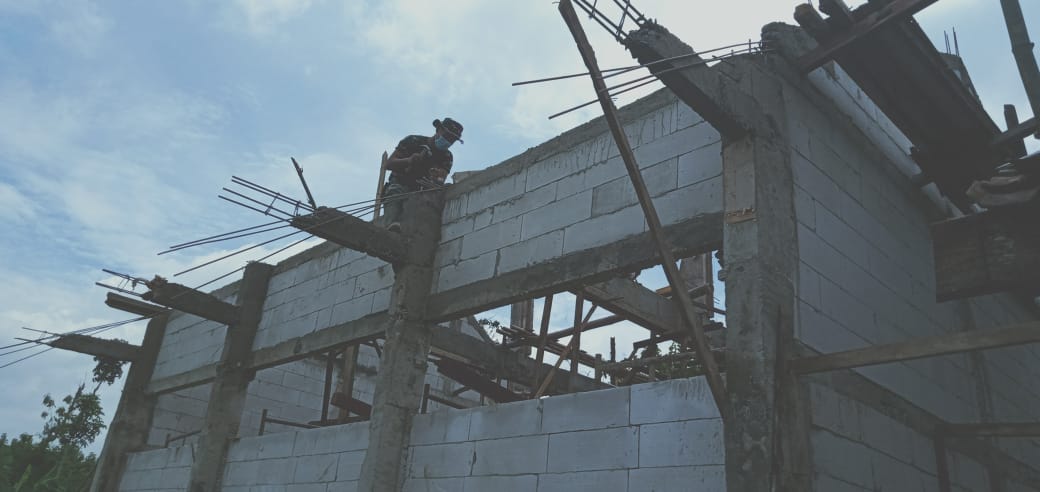 Satgas Kodim 0813 Bojonegoro, Serda Edi terlihat bersemangat naik membantu pengecoran Ring Atas Dinding.