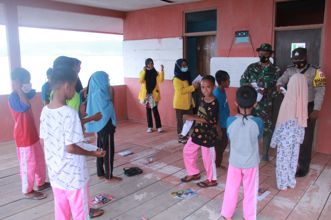Sertu Nurwakid Babinsa Koramil 1501-02/Pulau Hiri Kodim 1501/Ternate dan bhabinkamtibmas brigadir yuni Sahril beserta tim Mahasiswa KKN ( kuliah Kerja Nyata) di Kelurahan Tafaga melaksanakan sosialisasi/himbauan serta pembagian masker kepada anak-anak dan masyarakat Kelurahan Tafaga Kecamatan Pulau Moti, Kota Ternate