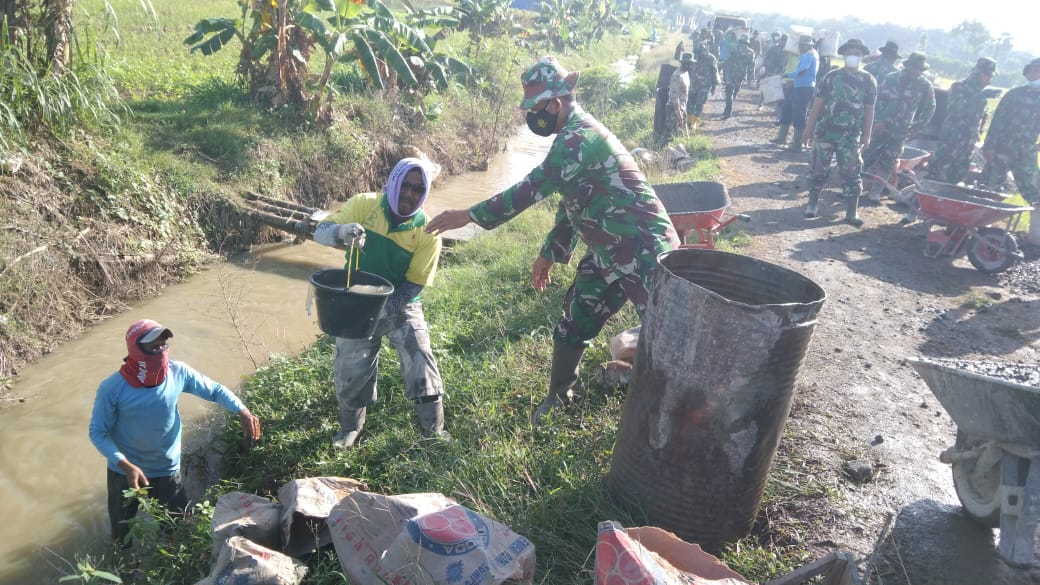 Pembangunan jalan desa yang kini sudah mencapai 80% pengerjaannya dari jarak 1.450 meter yang dikerjakan pertengahan juni lalu, sampai kini masih dikebut sisa pembangunannnya, Terlihat semua orang sedang berjibaku dengan kesibukan masing-masing, Tidak terkecuali dengan anggota TNI Satgas TMMD yang berada dibagian penyedia air untuk tandon. Dia bersama-sama dengan warga lainnya, bahu membahu penuhkan Tandon air yang ada di tong.