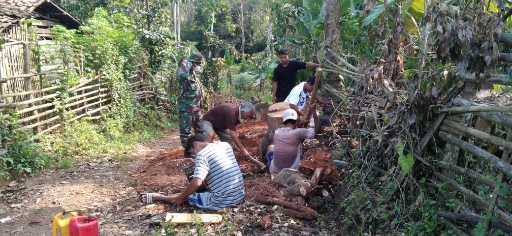 Sembari menunggu alat berat, Warga dan Anggota Satgas TMMD Ke-111 Kodim 0427/Way Kanan bekerja sama untuk membongkar akar kayu dengan mengunakan alat seadanya seperti Kampak, Cangkul, Tembilang dan Golok, ini dilakukan karena jika akar kayu ini tidak dibongkar maka alat berat tidak bisa masuk ke lokasi pembukaan badan jalan.
