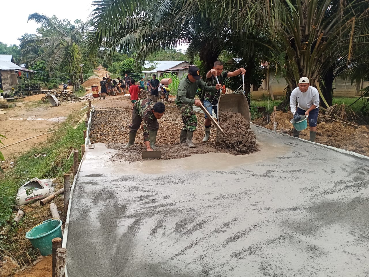 Warga setempat sangat bersemangat untuk saling bahu-membahu membantu bapak-bapak Tentara yang sedang melaksanakan kegiatan pembangunan pengecoran jalan. Pelibatan warga ini guna mempercepat dalam penyelesaian pengecoran.
