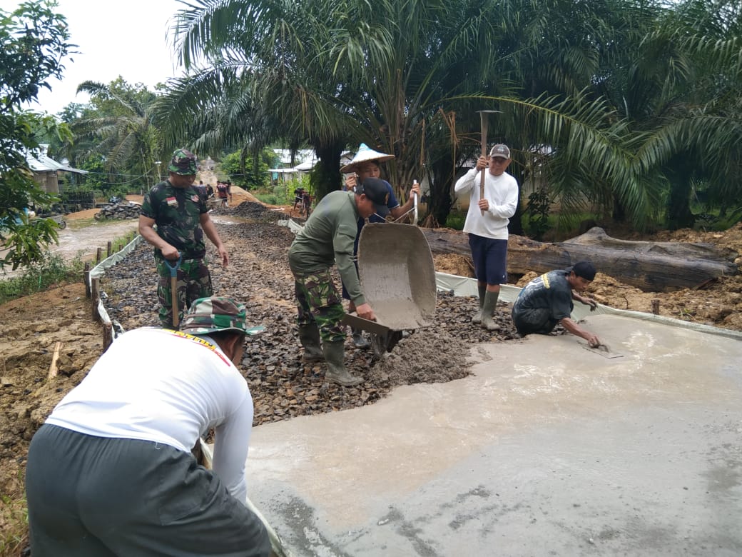 Warga setempat sangat bersemangat untuk saling bahu-membahu membantu bapak-bapak Tentara yang sedang melaksanakan kegiatan pembangunan pengecoran jalan. Pelibatan warga ini guna mempercepat dalam penyelesaian pengecoran.