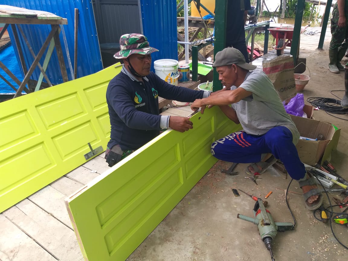 Kapuas,- Semangat kebersamaan Anggota TNI yang tergabung dalam Satgas TMMD reguler ke-110 tahun 2021, Kodim 1011/KLK yang di pusatkan di Desa Saka Lagun, Kecamatan Pulau Petak, Kebupaten Kapuas, mulai melakukan pekerjaan pemasangan kusen pintu dan jendela Mushola Miftahul Jannah, Jumat (26/3/2021).
