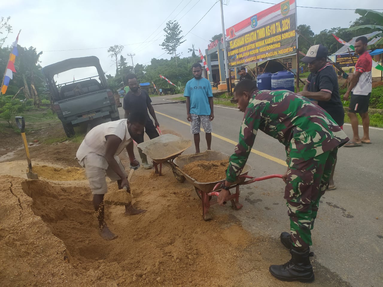 Sorong, Papua Barat. – Satgas TNI Manunggal Membangun Desa (TMMD) ke 110 Kodim 1802/Sorong yang di selenggarakan di Kampung Kamlin, Distrik Wemak, Kabupaten Sorong bersama warga terus bahu membahu kejar target pekerjaan TMMD.Rabu(17/03/2021)