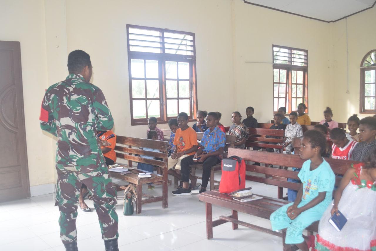 Pada kesempatan yang sama Terlihat Prada Karubaba, salah satu anggota Satgas TMMD melaksanakan kegiatan ibadah minggu bersama anak – anak dikampung bertempat di Balai Kampung Kamlin.