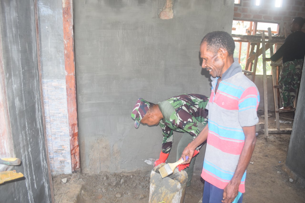 Serma Yahya , Anggota Kodim 1802/Sorong mengatakan dirinya bersama dengan anggota Satgas TMMD lainnya dan dibantu oleh warga kampung terus kebut pengerjaan plester dinding rumah milik Bapak Yowel Odemi. “Setelah pengerjaan plester dinding nanti akan dilanjutkan dengan pengacian dinding,”ucap Serma Yahya.