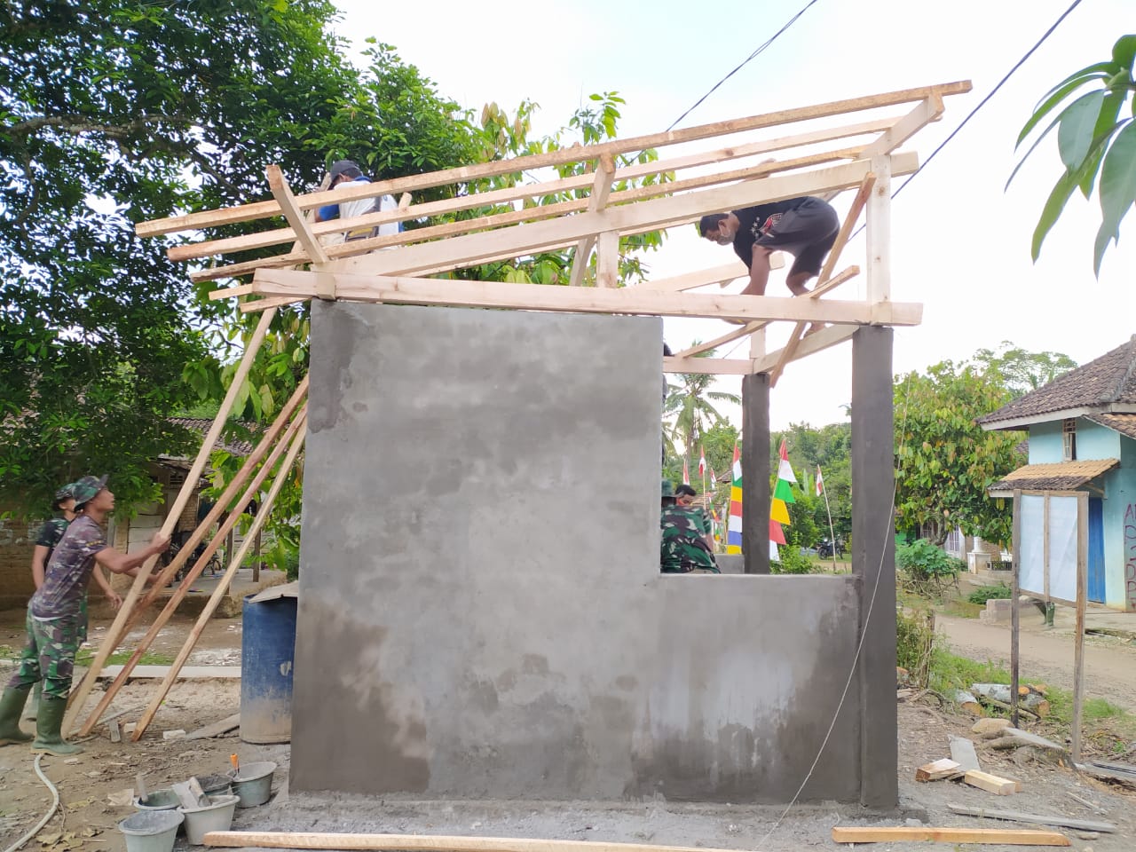 Terlihat Prajurit TNI dan Warga terus berupaya menyelesaikan pembangunan Poskamling yang ada di Dusun Balirejo ini. Kekompakan juga terlihat ketika Prajurit TNI Satgas TMMD mengulurkan kayu untuk atap kepada Warga yang berada di atas atap Poskamling.