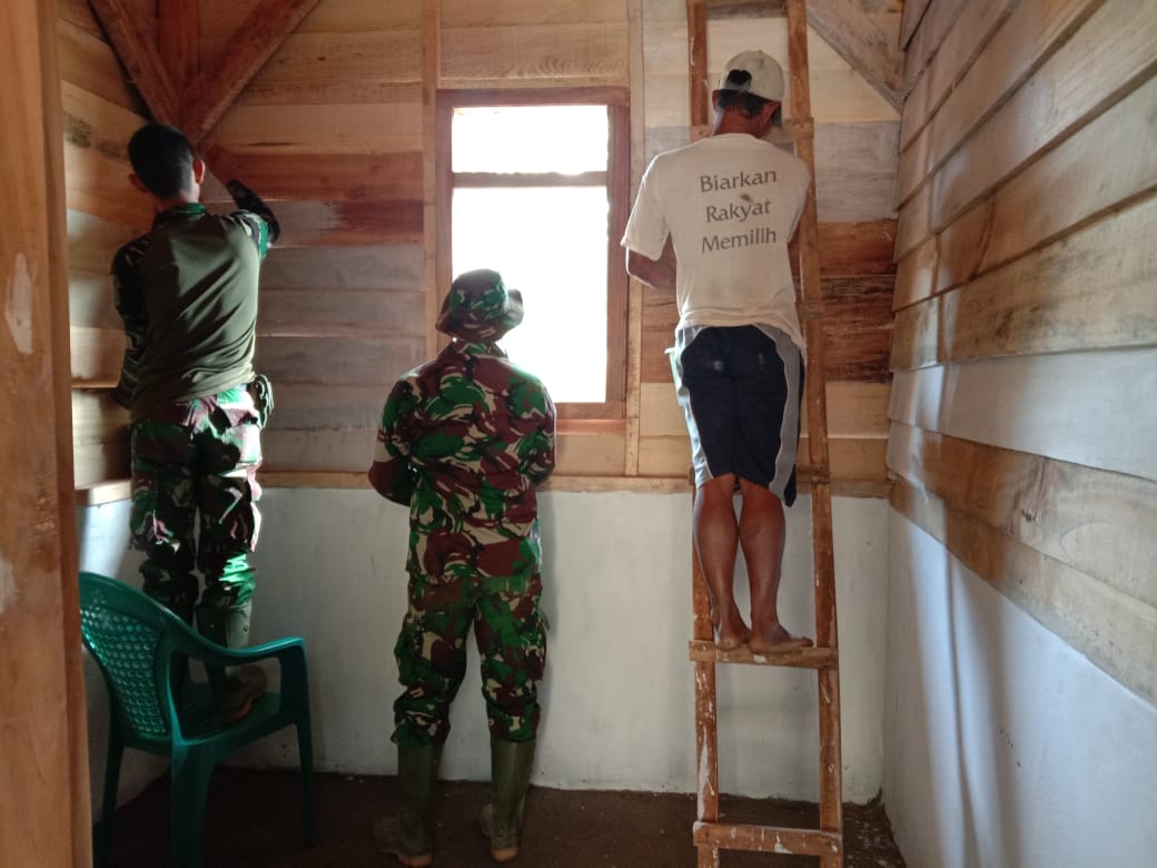 WAY KANAN – Sebanyak 5 unit rumah semi permanen program TNI Manunggal Membangun Desa TMMD ke-111 Kodim 0427/Way Kanan memasuki tahap pengecatan dinding rumah bagian.
