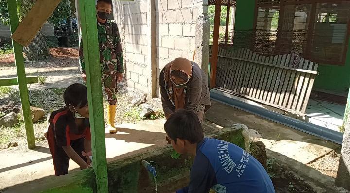 Seperti yang dilakukan Personil Satgas TMMD Ke-111 Serda Stefelik Hendry kembali mengajak warga untuk membiasakan diri untuk mencuci tangan setelah melakukan aktivitas diluar.