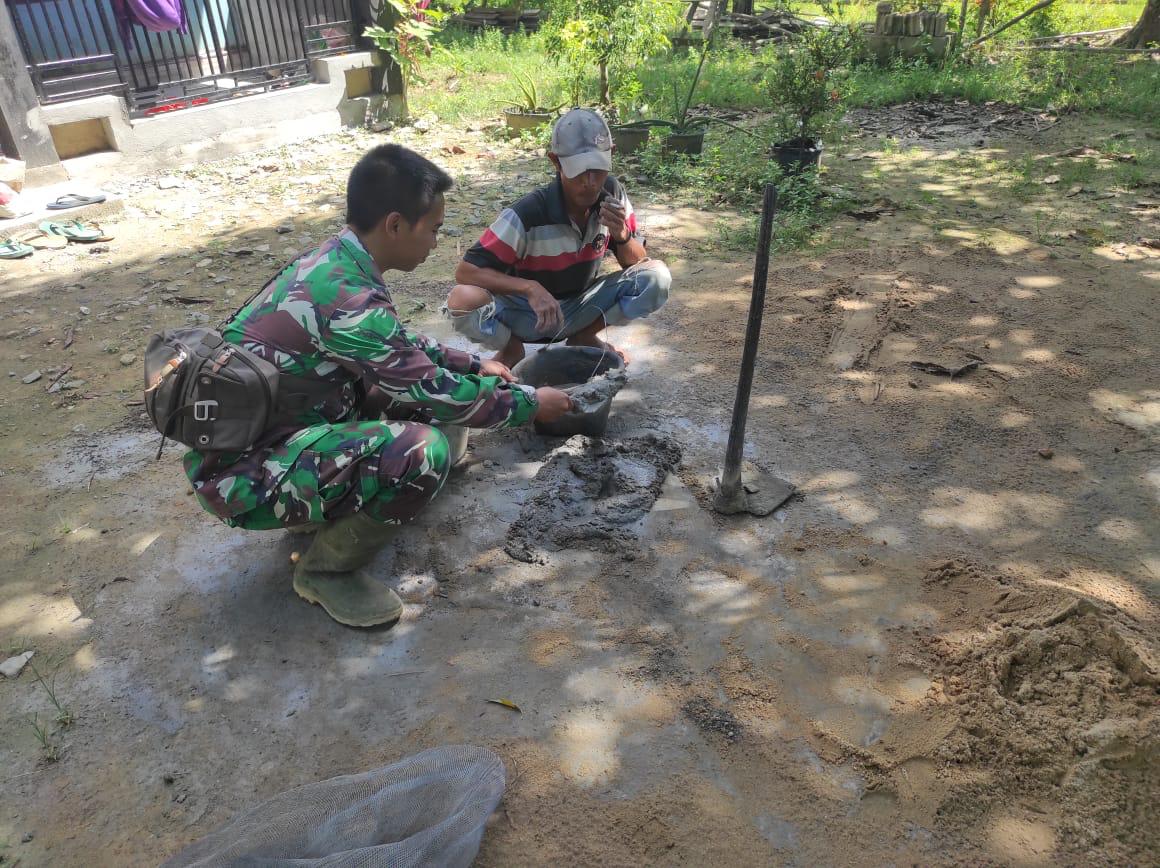 Meski sudah menjadi tentara, Serda Dhika, tanpa canggung membantu Anto(26), warga Desa Sentangau Jaya ikut menyiapkan proses pembuatan bahan cor tersebut.