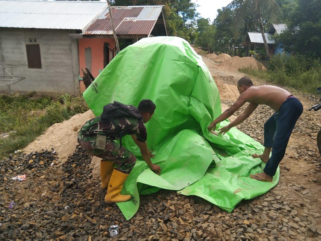 Bengkayang – Untuk memastikan kualitas material yang akan digunakan untuk pembangunan jamban tidak basah kena hujan, Satgas TMMD 111 Kodim 1202/Skw di Dusun Trimulya Desa Sentangau Jaya Jalan Trans Segorong Kecamatan Seluas Kabupaten Bengkayang menutup tumpukan pasir dengan menggunakan terpal.