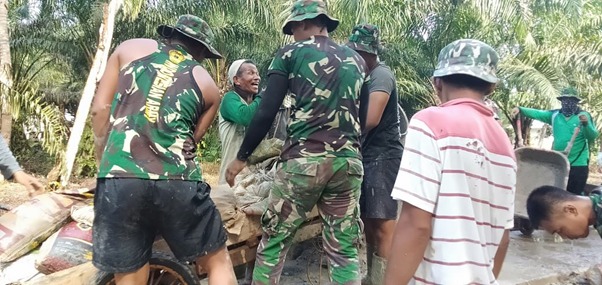 Kubu Raya – Satgas TMMD ke-111 Kodim 1207/Pontianak bersama warga saling bahu membahu melaksanakan pengecoran jalan di Desa Kuala Mandor B, Kecamatan Kuala Mandor B, Kabupaten Kubu Raya, Senin (21/06/2021).