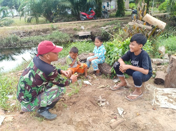 Tim satgas TMMD ke-111 Kodim 1207/Pontianak mulai bercerita, anak-anak dengan serius menyimak satu pesan ke pesan lainnya yang dari tim satgas TMMD, saat istirahat di lokasi TMMD pembangunan fisik jalan rabat beton.