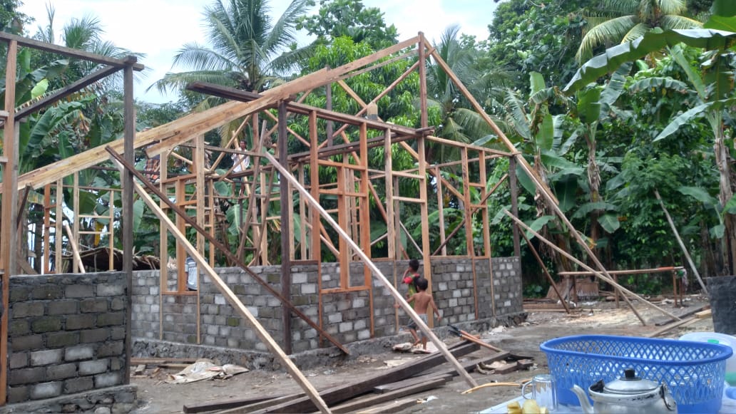 Anggota Satgas TMMD Kodim 1501/Ternate, bersama warga masyarakat membangun rumah tidak layak huni (RTLH) milik Ibu Majidah sudah pada tahap pemasangan rangka rumah dan rencananya setelah selesai rangka dipasang akan dilanjutkan pemasangan atap seng.