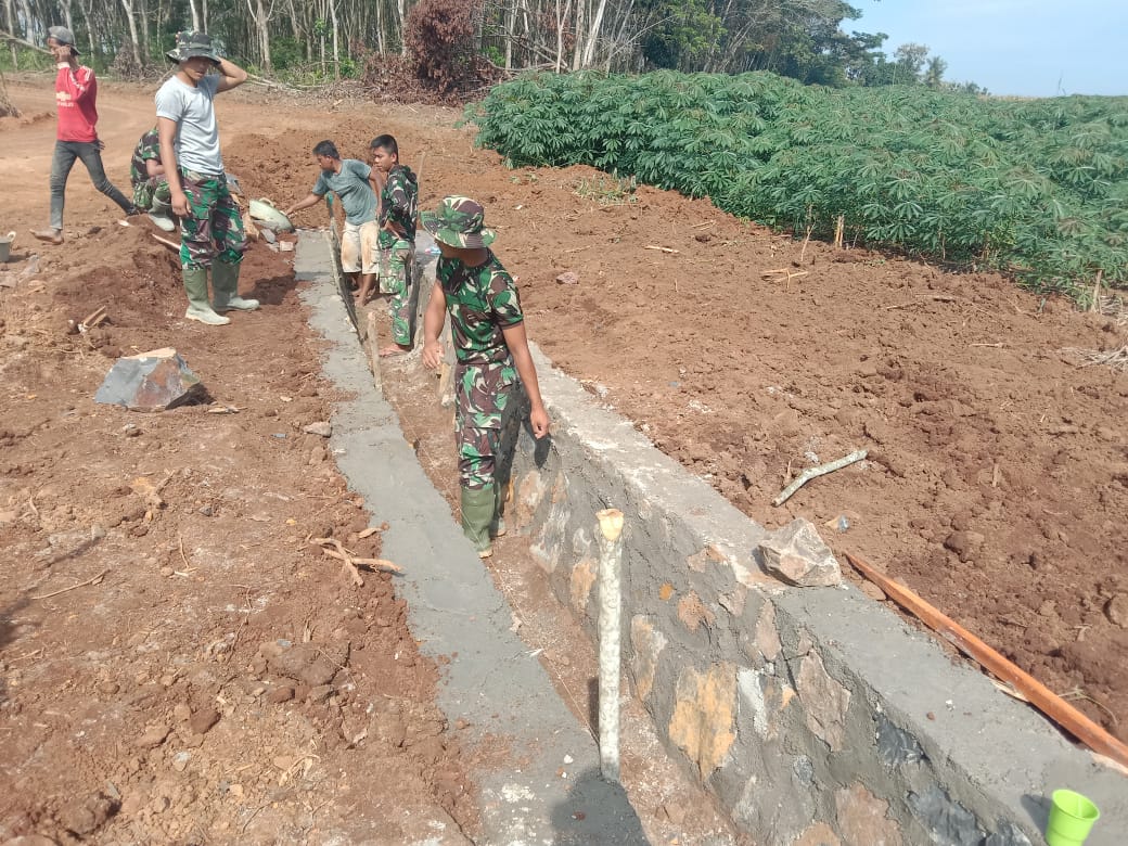 Pemecahan Batu, Mengaduk Semen dan Pemasangan Batu Gunung, dalam Pembuatan Gorong-gorong dan Talud untuk mensukseskan Program TMMD ke 111 Kodim 0412/LU Sangat dibutuhkan. (Jum’at, 25/06/2021).