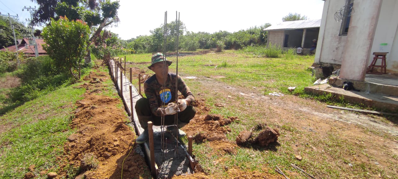 Bengkayang- Pembagunan pagar Gereja Katolik Santo Kristoforus, yang merupakan sasaran TMMD Ke-111 yang sedang berlangsung di Desa Sentangau Jaya, Kecamatan Seluas, Kabupaten Bengkayang, saat ini memasuki tahap pekerjaan pembuatan tiang pagar gereja pada badan dasar pagar gereja yang sebelumnya telah dicor.