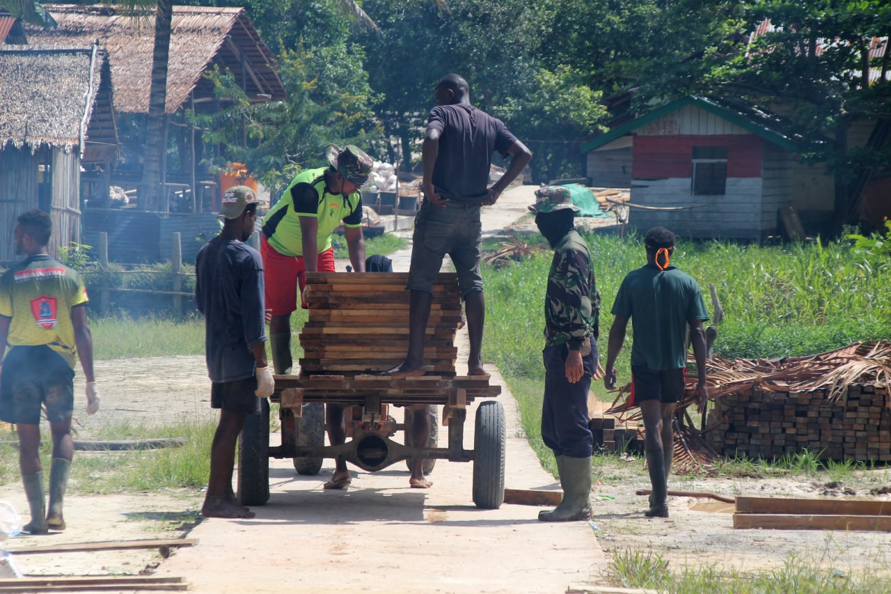 Bukan itu saja, masyarakat Kampung Okor juga selalu turut serta membantu membangun pondasi dan memasang rangka kayu 20 unit rumah yang menjadi sasaran TMMD ke-112 Kodim 1707/Merauke.