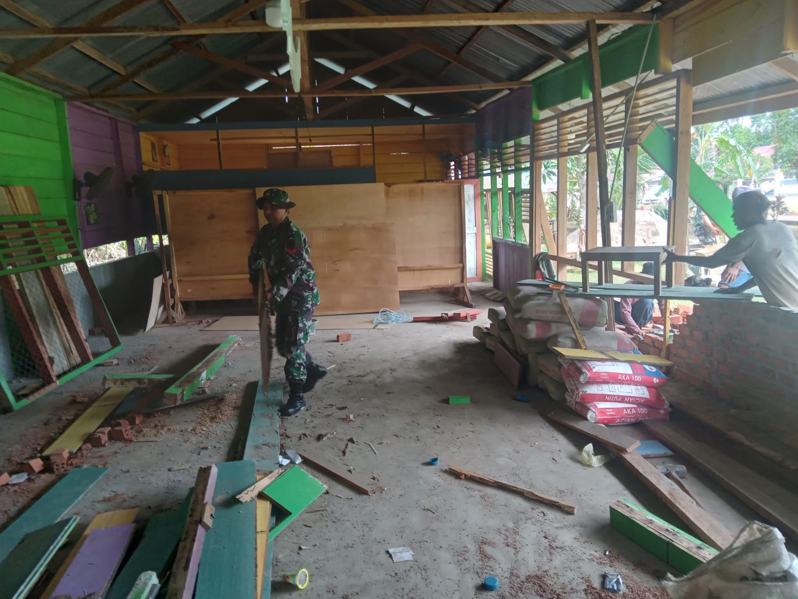 Terlihat anggota Satgas TMMD ke 122 mulai melakukan pemasangan dinding, dan mempersiapkan material lainnya. Renovasi sekolah madrasah Darul Ulum ini meliputi perbaikan dinding, kusen, lantai hingga plafon.