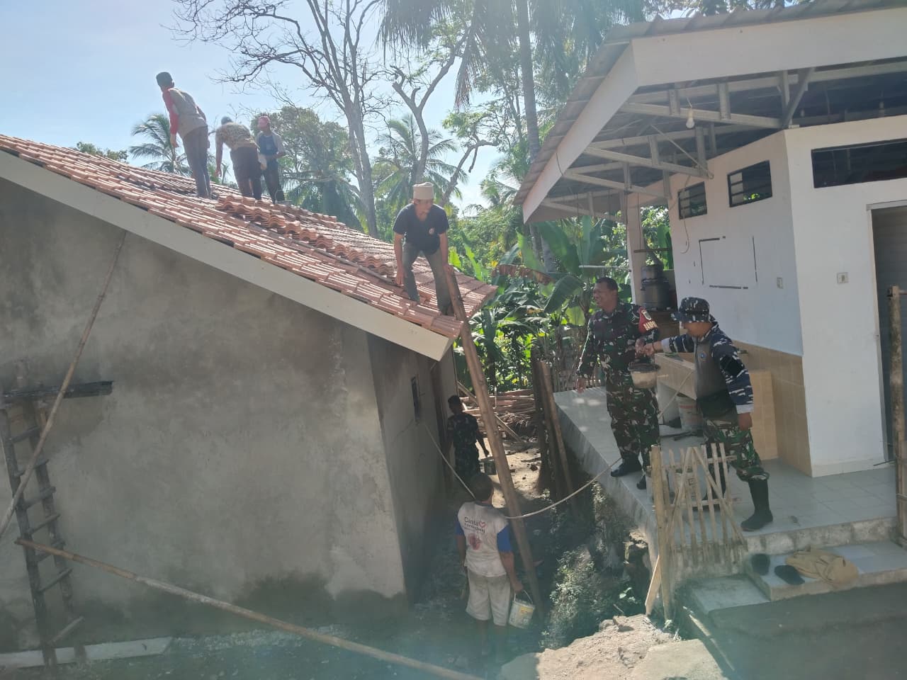 Selain itu, beberapa personel terlihat membantu dari bawah dengan menyiapkan bahan bangunan, sementara yang lain bekerja di atas atap untuk mempercepat penyelesaian pekerjaan. Kekompakan dan gotong royong antara TNI dan masyarakat menjadi gambaran nyata dari semangat kebersamaan yang selalu dikedepankan dalam setiap kegiatan TMMD.