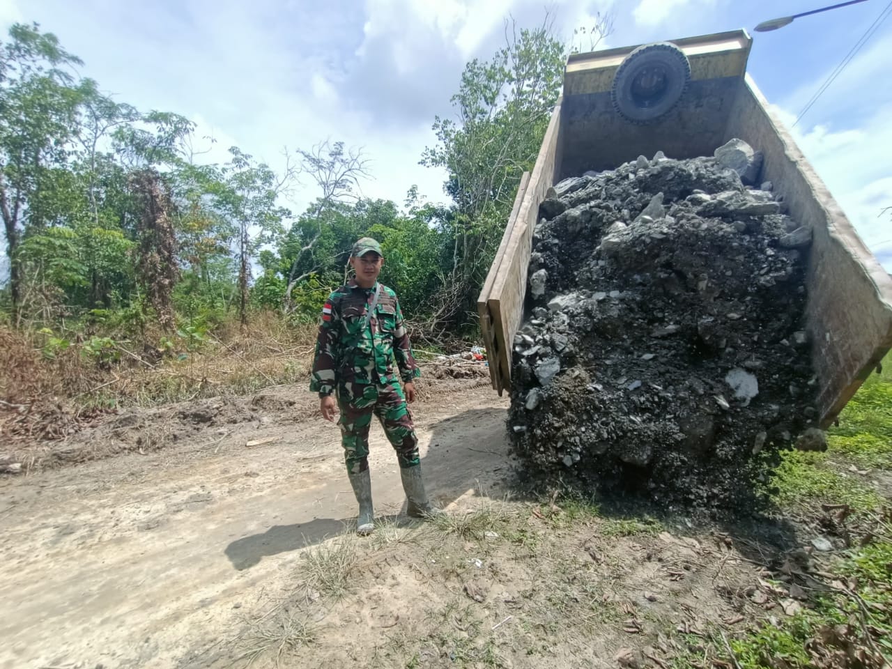 Sambas – Satgas TNI Manunggal Membangun Desa (TMMD) ke-126 Kodim 1208/Sambas terus melanjutkan proses penimbunan jalan di lokasi sasaran fisik program TMMD. Dengan memanfaatkan truk pengangkut material, personel Satgas bersama warga setempat bahu membahu menimbun badan jalan sepanjang 2000.