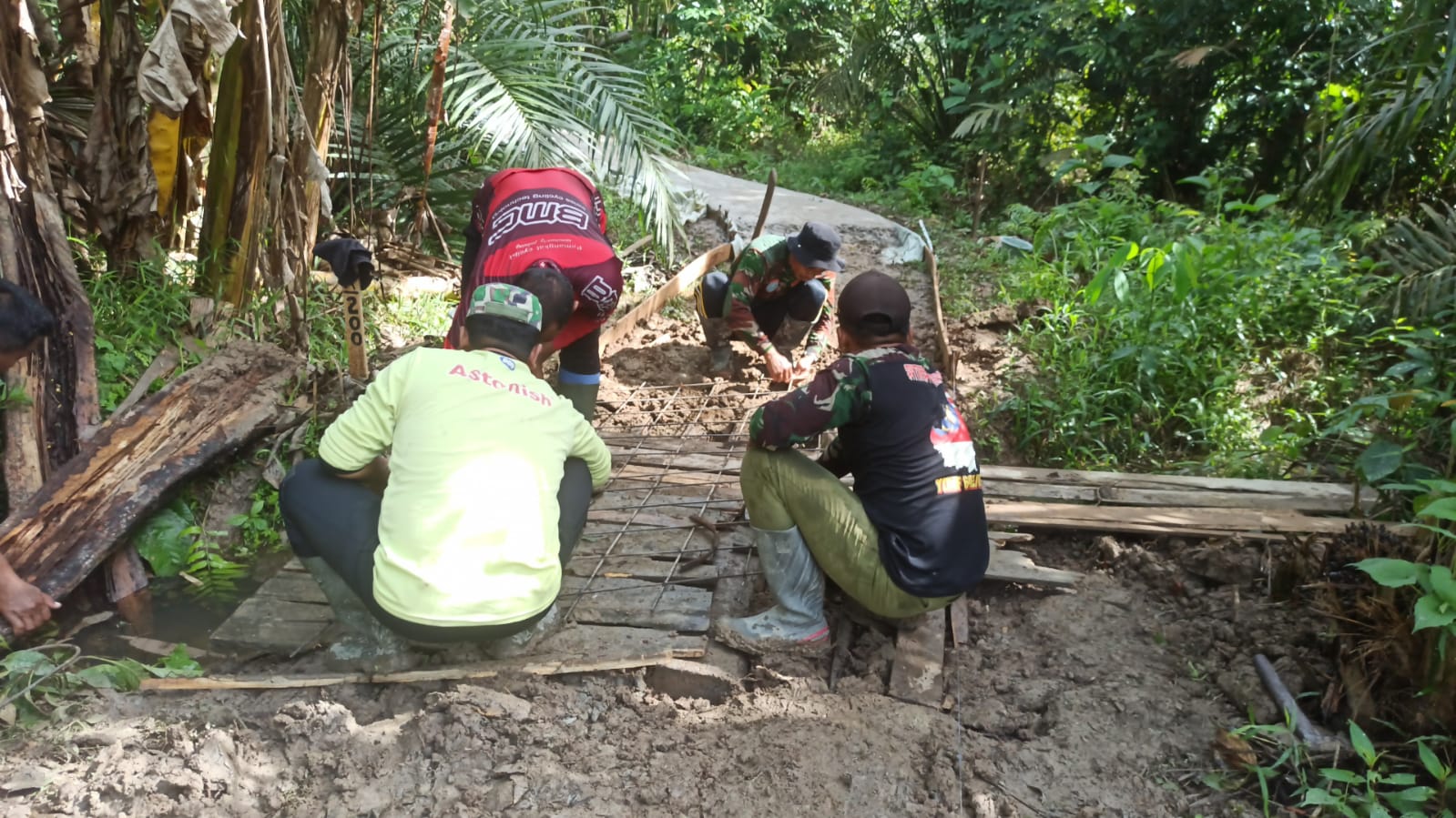 Pemasangan besi ini dilakukan untuk memperkuat struktur pondasi jembatan agar mampu menahan beban kendaraan dan aktivitas masyarakat di kemudian hari. Dengan kerja sama dan semangat gotong royong antara personel Satgas dan warga setempat, proses pengerjaan berjalan lancar.
