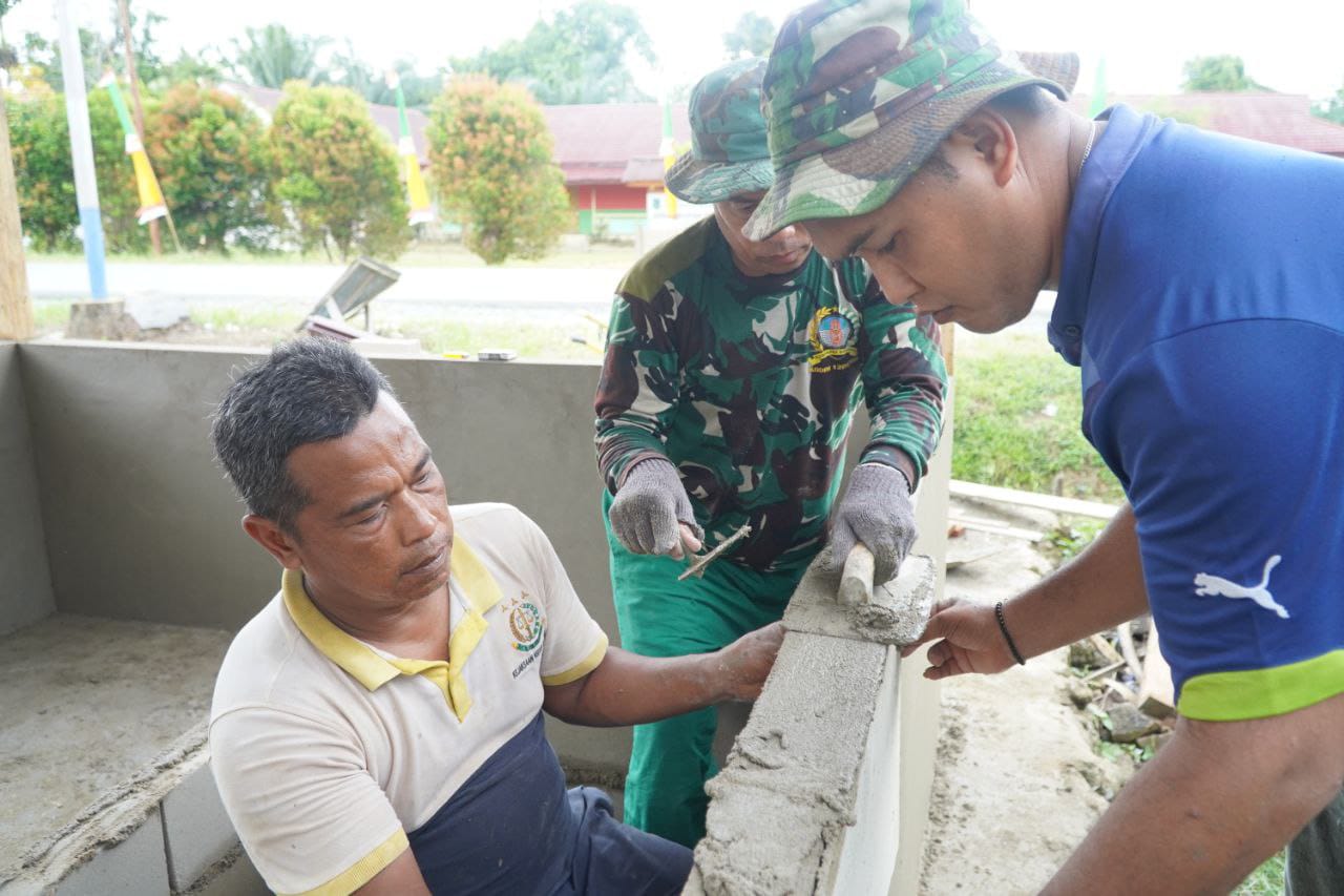 Dengan semangat gotong royong, anggota Satgas bersama warga bahu membahu menyelesaikan proses plester dinding poskamling. Kegiatan ini merupakan bagian dari upaya mempercepat pembangunan fasilitas keamanan warga sekaligus memperindah tampilan bangunan yang telah dibangun.