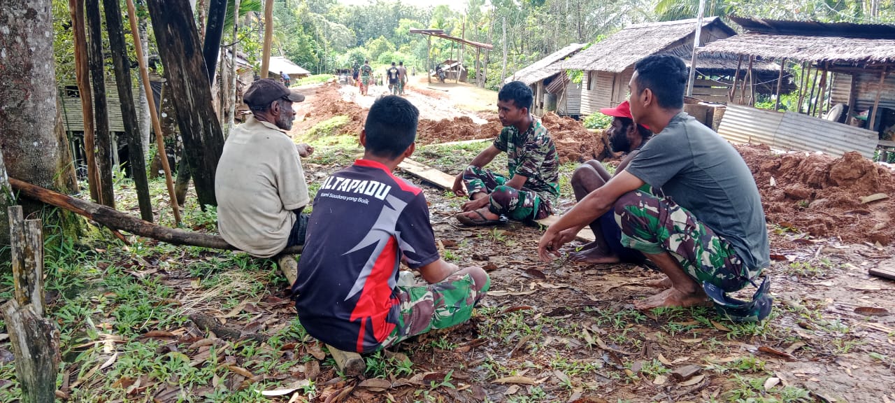 Salah satu kegiatan Komsos yang rutin dilaksanakan terlihat saat Praka Subandi bersama dua rekannya dari Satgas TMMD berdialog santai dengan beberapa warga Kampung Waropko RT 06. Mereka tampak duduk bersama di tanah yang agak becek, dekat lokasi pengerjaan proyek, menunjukkan suasana kehangatan dan kesederhanaan.