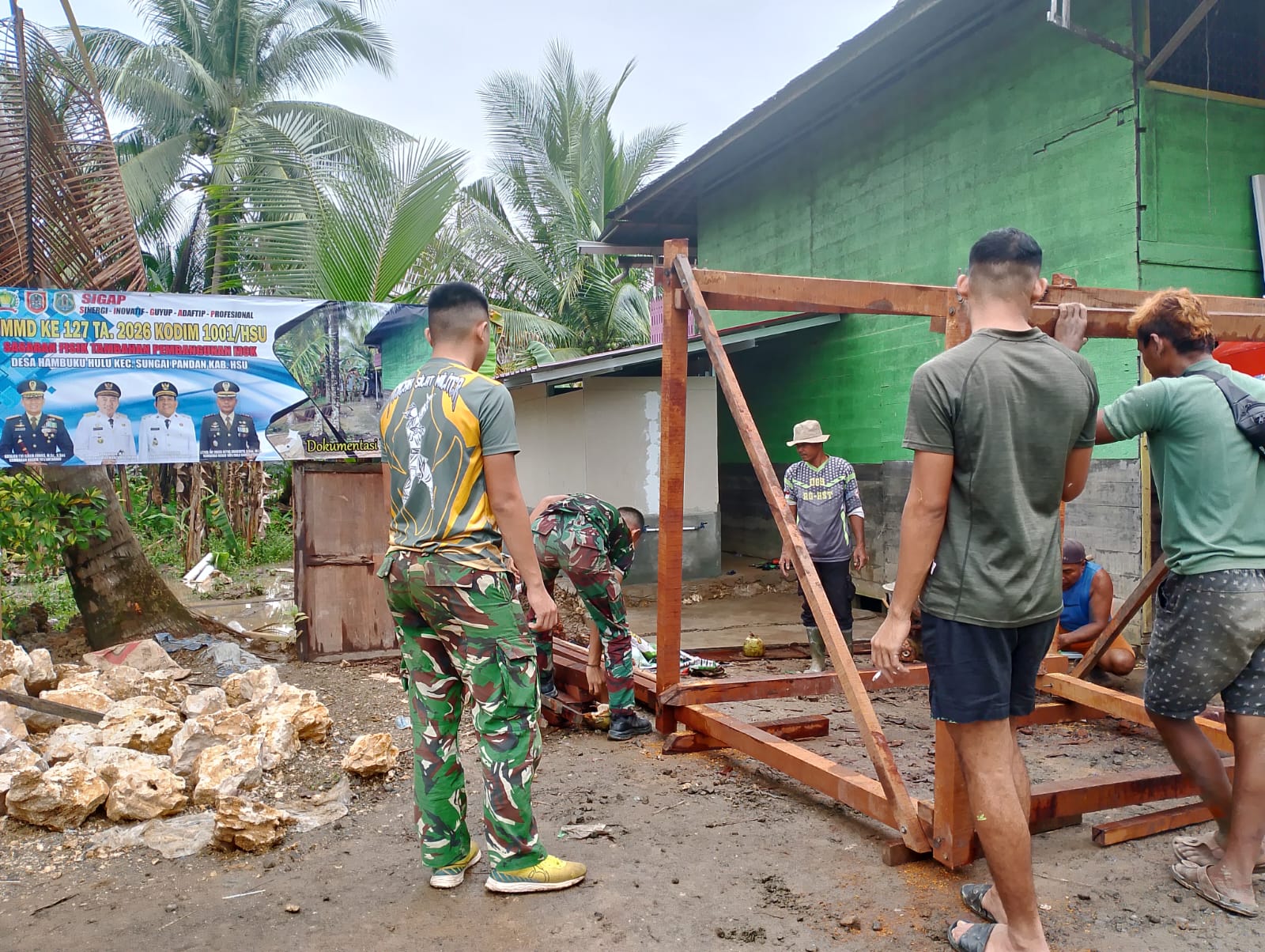Hulu Sungai Utara – Satgas TNI Manunggal Membangun Desa (TMMD) ke-127 Kodim 1001/HSU-BLG melaksanakan pembangunan fasilitas Mandi, Cuci, Kakus (MCK) di TPA Al Ikhlas serta Musholla/Langgar Darul Ibadah yang berlokasi di Desa Hambuku Hulu, Kecamatan Sungai Pandan, Kabupaten Hulu Sungai Utara, Minggu (15/02/2026).