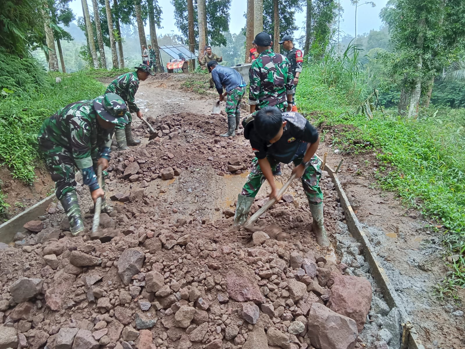 Cipelah, Kab. Bandung – Semangat gotong royong terus berkobar di Desa Cipelah, Kecamatan Rancabali, Kabupaten Bandung, dalam pelaksanaan program TNI Manunggal Membangun Desa (TMMD) Reguler Ke-127 Kodim 0624/Kab. Bandung. Pada Jumat, 27 Februari 2026, anggota Satgas TMMD Reguler Ke-127 Kodim 0624/Kab. Bandung bersama masyarakat Desa Cipelah, dipimpin Danramil 2414/Ciwidey Kapten Inf Supriadi, melaksanakan kegiatan perataan beskos dan pemasangan bekisting di titik 400, sebagai persiapan untuk pengecoran jalan pada malam hari. Kegiatan ini dimulai pukul 08.00 WIB dan berlangsung hingga selesai.