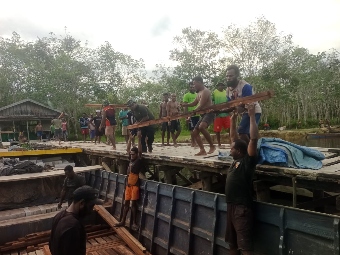 Pada pukul 10.45 WIT, sebuah kapal kayu/belang yang membawa material bangunan TMMD tiba dan sandar di dermaga Kampung Yibin. Kedatangan material ini disambut antusias oleh anggota Satgas TMMD Kodim 1704/Mappi dan warga setempat.