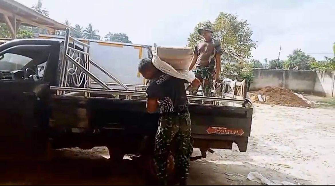 LAMTIM – Jiwa–jiwa tangguh dan petarung ditunjukan oleh personil Satgas TMMD ke-124 Kodim 0429/Lamtim pada saat mengangkut material semen untuk dibawa ke lokasi pembangunan rabat beton, di Dusun 4 Desa Itik Rendai, Minggu (25/5/2025).