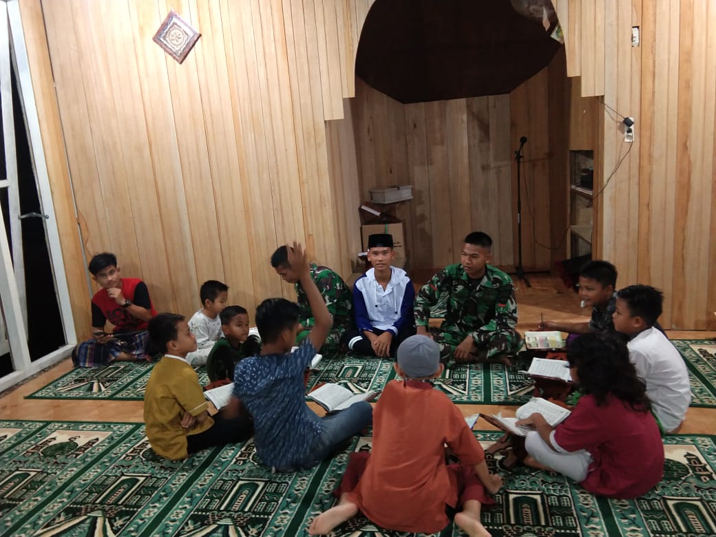 Mentawai – Tidak hanya mengerjakan kegiatan fisik, Satgas TMMD ke 110 Kodim 0319/Mentawai juga rutin mengajar ngaji anak-anak di mushallah mujahidin Desa Bukit Pamewa Kecamatan sipora utara Kabupaten kep.Mentawai