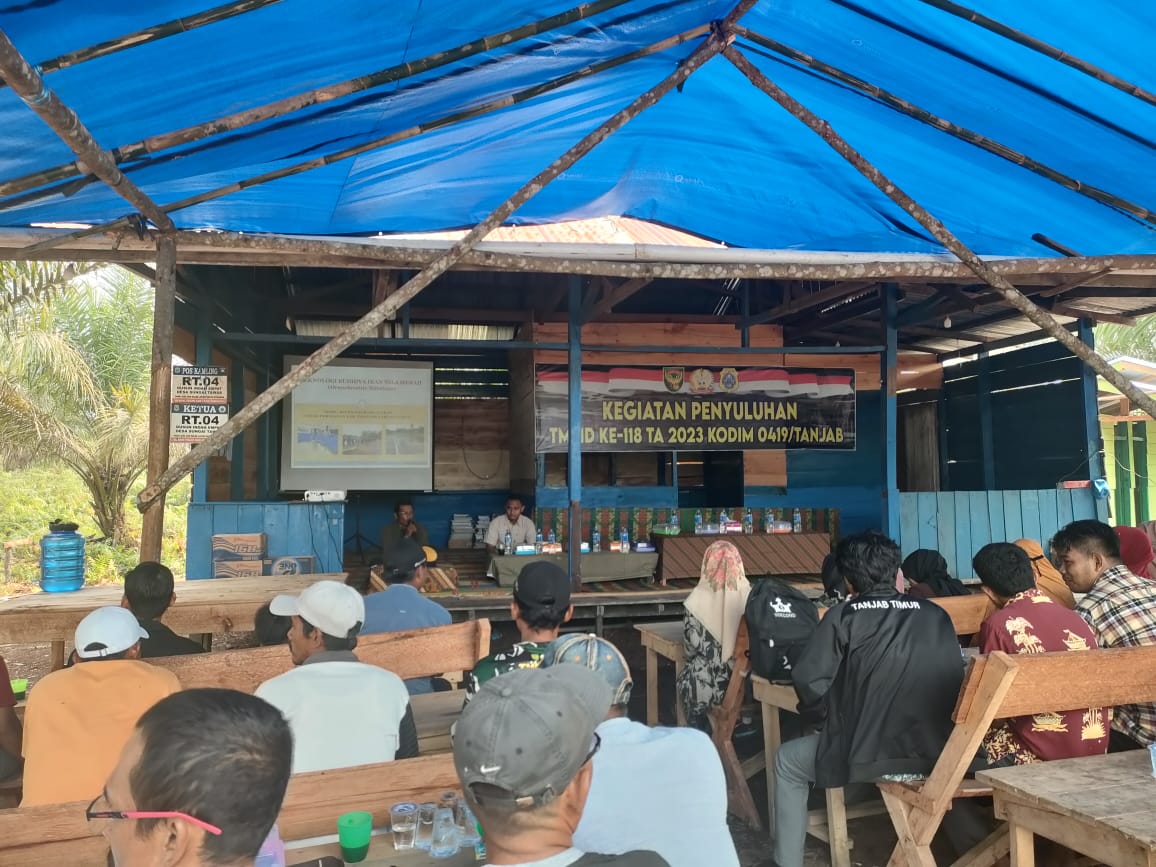 Tanjab – Sesuai tema yang diusung pada operasi TMMD ke 118 tahun 2023 Kodim 0419/Tanjab yaitu ” SINERGITAS LINTAS SEKTORAL MEWUJUDKAN KEMANUNGGALAN TNI-RAKYAT, sangat tepat karena dalam operasi TMMD kali ini, semua instansi pemerintah daerah dan Kepolisian turut berpartisipasi dalam membantu mensukseskan pelaksaanan TMMD ke 118 yakni membantu sesuai dengan bidang masing-masing. Pada kesempatan saat penyuluhan oleh Dinas Pertanian disamping memberikan penyuluhan tentang bagaimana bercocok tanam pada daerah gambut yang tanahnya sendiri mengandung unsur asam yang cukup tinggi. Zat asam ini sangat tidak cocok untuk ditanami tanaman umur pendek atau palawija, namun ada cara yang diberikan oleh dinas pertanian agar ketika menanam palawija termasuk cabe harus memperhatikan sirkulasi air agar zat asam bisa terbawa atau air mengalami pertukaran sehingga hal ini dapt mengurangi tingkat keasaman dari lahan itu sendiri, dengan cara menebarkan dolomit sebelum dilakukan penanaman. Beberapa langkah yang harus diikuti yaitu :