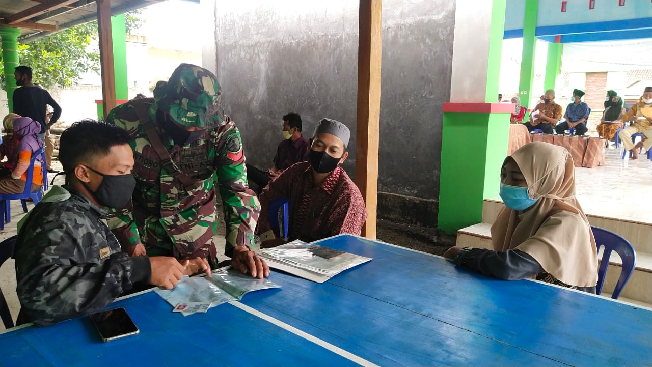 BOJONEGORO – Satgas TMMD 110 Kodim 0813 / Bojonegoro, Sertu Agus Rahmad Memantau dan membantu mengurus surat administrasi kepandudukan seperti KK dan E-KTP di balai desa Jatimulyo.