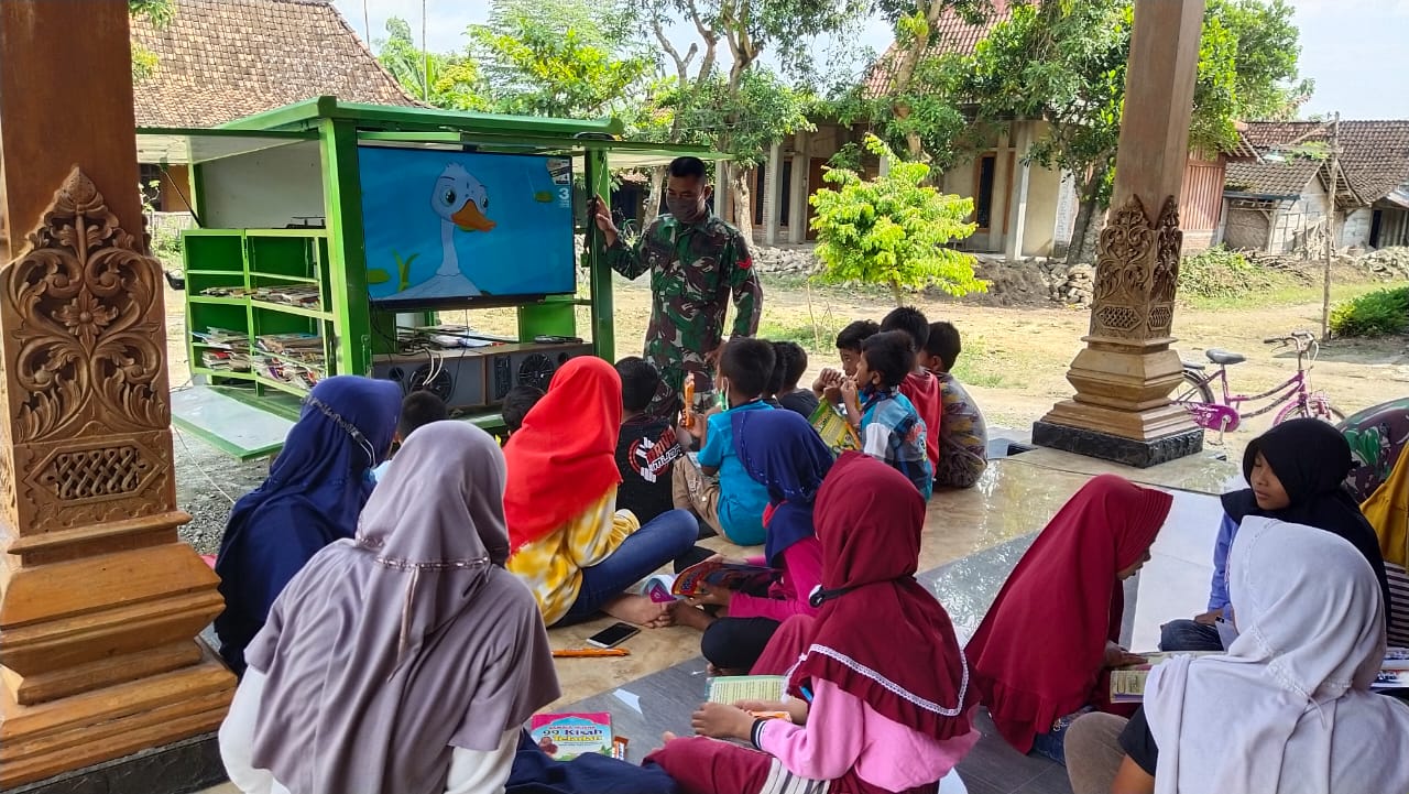 Bojonegoro – Untuk merangsang minat baca anak-anak yang ada di lokasi sasaran TMMD ke-110 Kodim 0813/Bojonegoro, satgas membuka perpustakaan keliling.