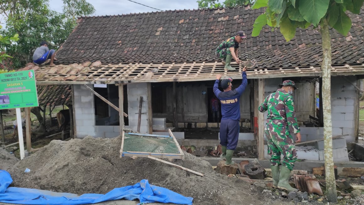 BOJONEGORO – Satgas TMMD Ke-110 Kodim 0813 / Bojonegoro pagi ini, kembali bekerja merenovasi Rumah bapak Samadun warga Rt. 3 Rw. 1 Desa Ngrancang Kecamatan Tambakrejo Kabupaten Bojonegoro yang saat ini memasang genteng.