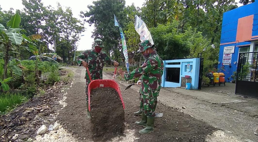 Bojonegoro – Tim satgas TMMD ke 110 Kodim 0813/Bojonegoro di desa Jatimulyo, Kecamatan Tambakrejo, Kabupaten Bojonegoro mengerjakan kegiatan sasaran fisik meratakan jalan Desa sebelum dilakukan pengaspalan.
