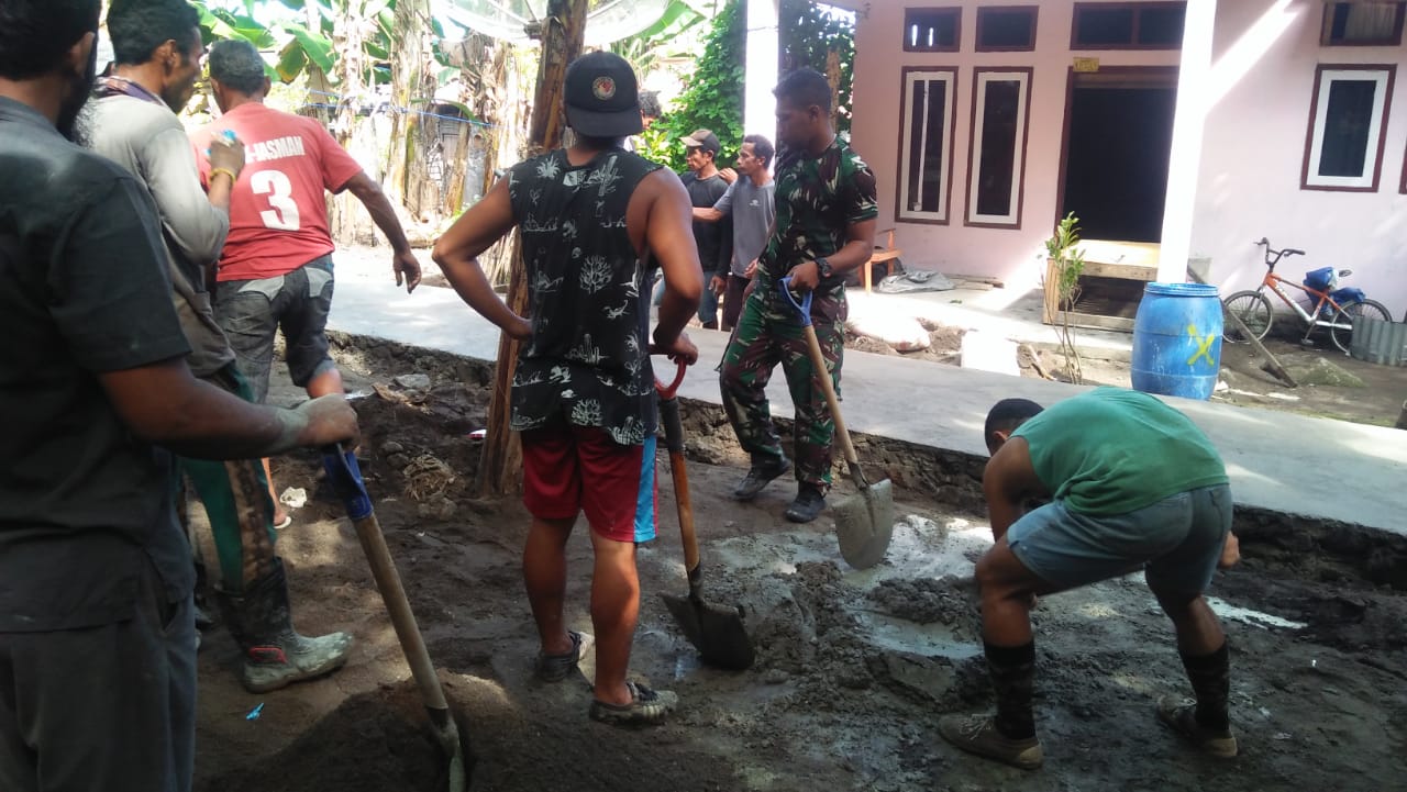 Parjurit TNI mewarnai suasana dengan canda tawa dan memberikan motivasi kerja kepada warga setempat yang turut membantu dalam pembangunan tersebut.