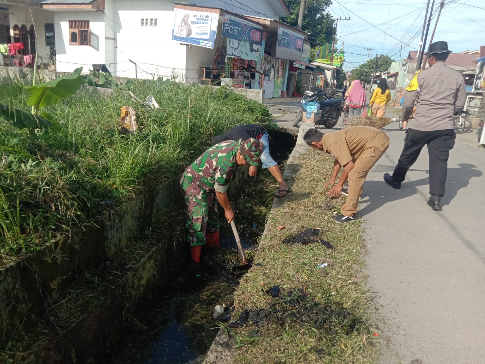 Kegiatan gotong royong kali ini difokuskan pada pembersihan saluran air (drainase) di tepi jalan raya. Terlihat anggota TNI (Satgas TMMD), Babinsa, warga, serta anggota Polri bersatu padu membersihkan parit dari rumput liar dan sampah yang menyumbat.