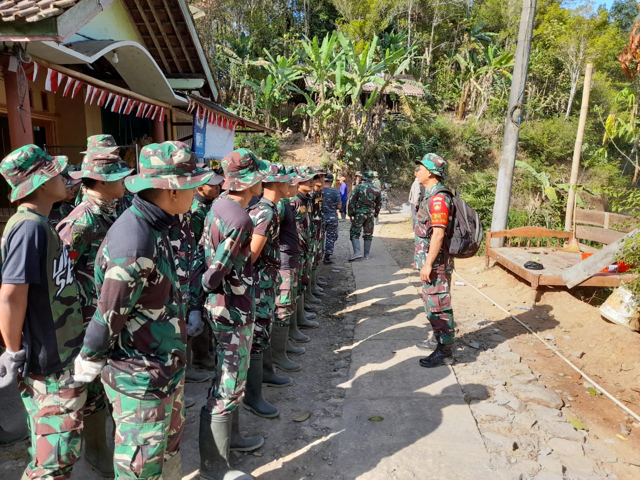 Purworejo..Sebelum mengerjakan tugas serta kegiatan fisik proyek TMMD anggota Satgas sedang berkumpul untuk diapelkan oleh Danton Satgas yang yakni Letda Arm Sucipto memberikan arahan seputar kegiatan yang akan dikerjakan hari ini dalam proyek TMMD Reguler 118 di Desa Benowo Kec Bener Kab Purworejo, Jumat (22-09-2023)