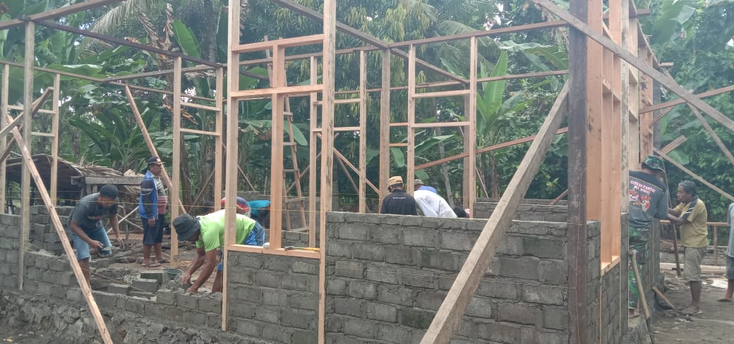 Tampak terlihat satgas TMMD bersama masyarakat bergotong royong menggarap RTLH. Meskipun cuaca kurang bersahabat mereka tetap melanjutkan pekerjaan sampai dengan waktu istirahat.