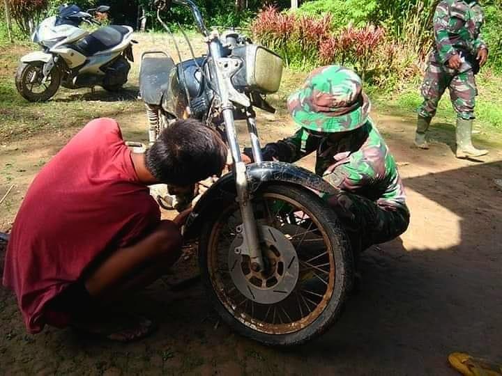 “Bapak TNI Memang luar biasa, tidak hanya bekerja membangun jalan saja tapi juga bisa memperbaiki motor saya yang rusak. Terima kasih Pak Tentara,” ucap Anto (20), pemilik motor yang rusak tersebut. (Pendim 1202/Skw)