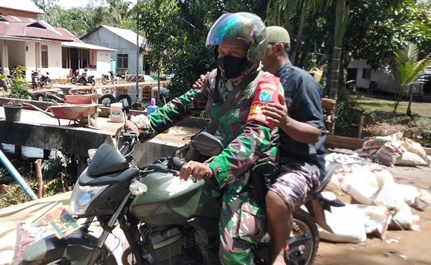 Kubu Raya – Salah satu anggota satgas TMMD 111 yang berlokasi di dsn Maju Jaya,Ds.Kuala Mandor B Kec.Kuala Mandor B, Kab.Kubu Raya Sertu F.Rahmanta terlihat membonceng salah satu warga yang akan melaksanakan sholat Jumat, Minggu (20/06/2021).