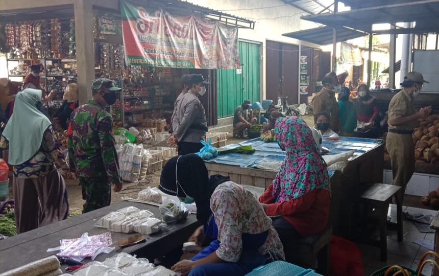 Pati – Penyebaran virus Covid -19 sampai detik ini belum mereda, sehingga penegakan disiplin protokol kesehatan harus ditingkatkan di tengah aktifitas masyarakat, untuk itu Babinsa Tamansari, Kecamatan Jaken, Kabupaten Pati, Sertu M. Jumroni bersama instansi terkait melaksanakan penertiban prokes di Pasar Tradisional yang di Kecamatan Jaken, Rabu (30/6/2021).