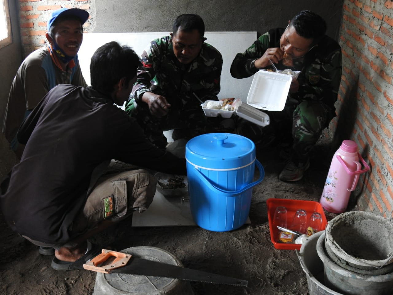 Suasana yang begitu nyaman penuh canda tawa ditunjukkan prajurit yang mengikuti Satgas TMMD Kodim 0429/Lamtim pada saat menikmati makan siang bersama di lokasi bedah Rumah Tidak Layah Huni (RTLH), Senin (15/3/2021).