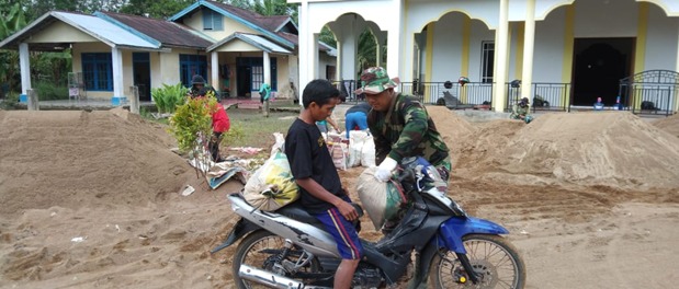Kubu Raya – Personil satgas TMMD Reguler Ke-111 Tahun Anggaran 2021 Kodim 1207/Pontianak di Kuala Mandor Desa Kuala Mandor B. Memanfaatkan karung karung bekas untuk mempermudah pengangkutan material pasir dan batu pecah, Minggu (20/06/2021).