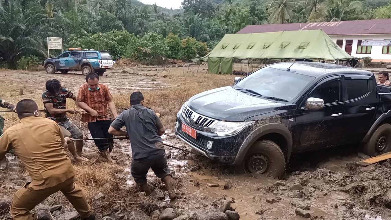 Satgas TMMD Kodim 0212/TS bersama anggota lainya membantu mobil Kadis PPKB Tapsel yang terperosok di lumpur di Lingkungan 2, Kel. Batu Rosak , Kec. Angkola Sangkunur Kab.Tapanuli Selatan, Serda Tomi Jepisa, Senin (5/7/2021), mengatakan Satgas berinisiatif bantu tarik Mobil Kadis PPKB yang terjebak lumpur.