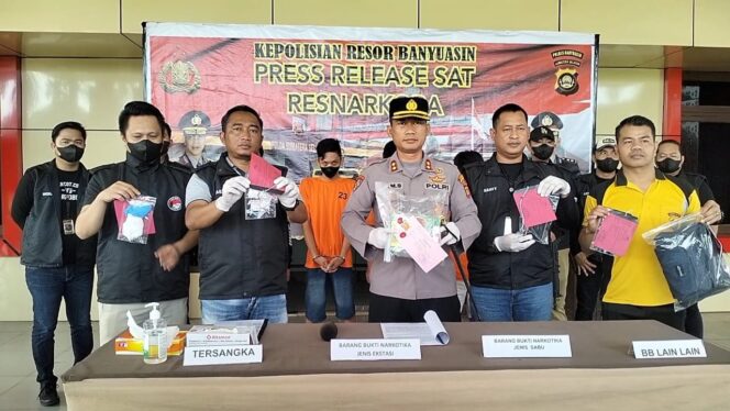Kapolres Banyuasin menyampaikan, hasil pengamanan penyalahgunaan narkotika, jenis sabu, dan narkotika jenis ekstasi ditangkap di tempat yang berbeda. Di antaranya di Kecamatan Betung dan Kecamatan Talang Kelapa.